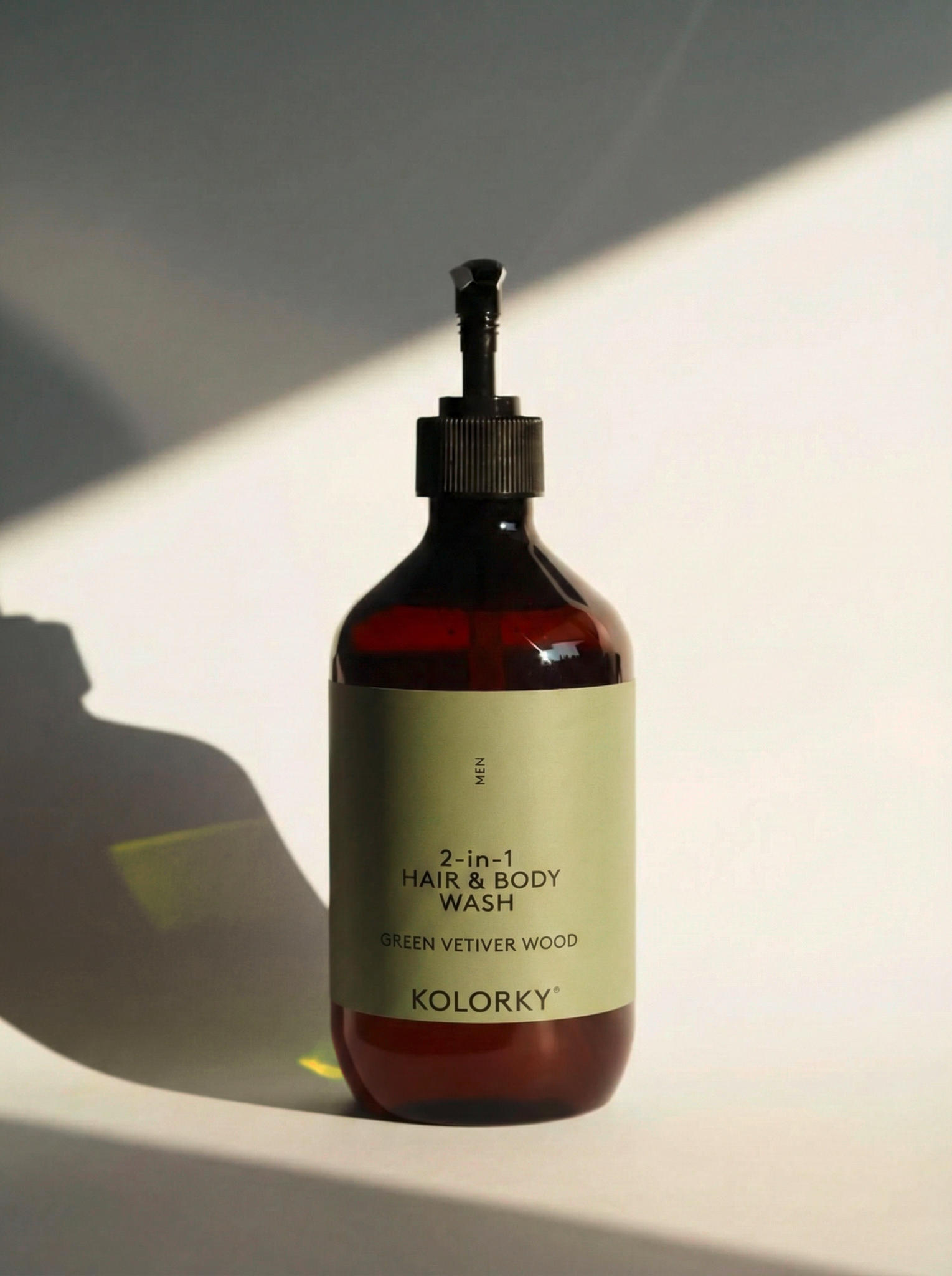 Szampon i żel pod prysznic o drzewnym zapachu wetywerii, przeznaczony dla mężczyzn, oczyszcza ciało i włosy, nawilża skórę oraz wzmacnia włosy.