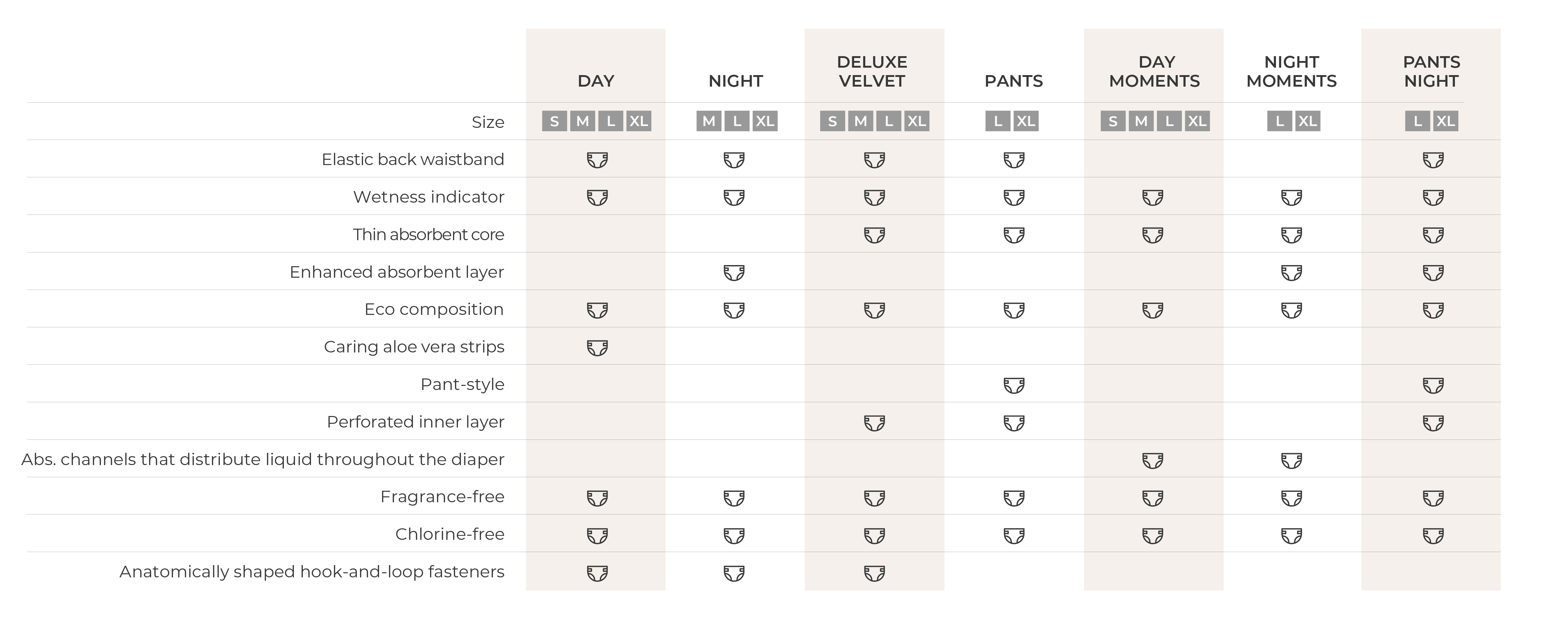 Werfen Sie einen Blick auf die Tabelle, in der die wichtigsten Merkmale aller unserer Windeltypen aufgeführt sind.