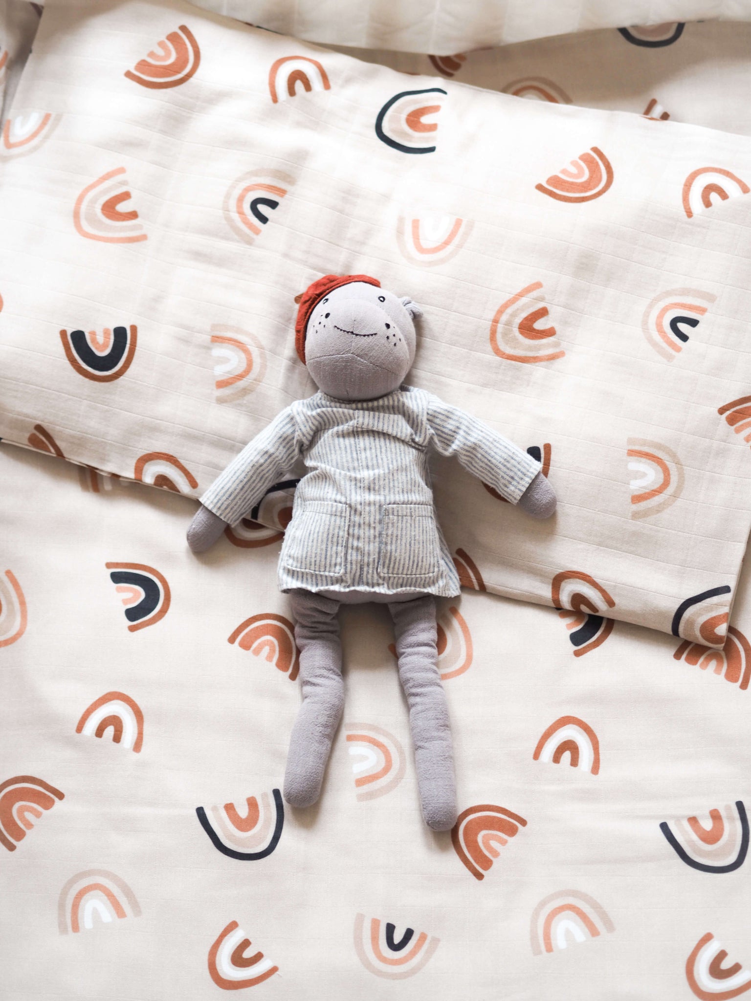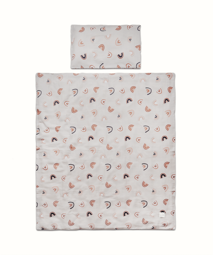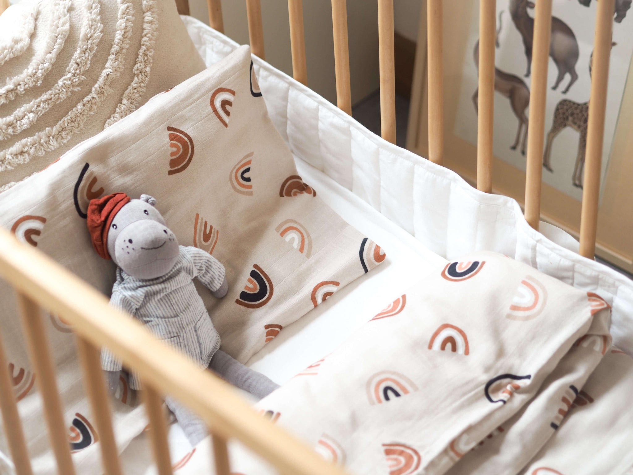 Set de lenjerie pentru pătuțul copilului din mușelin cu certificare GOTS. Mușelinul este un material foarte plăcut și copiii dumneavoastră se vor odihni minunat în el. Lenjeria include o față de pernă cu închidere tip plic și o husă pentru pilotă cu închidere cu capse. Designul minunat cu curcubee este universal și atemporal.
