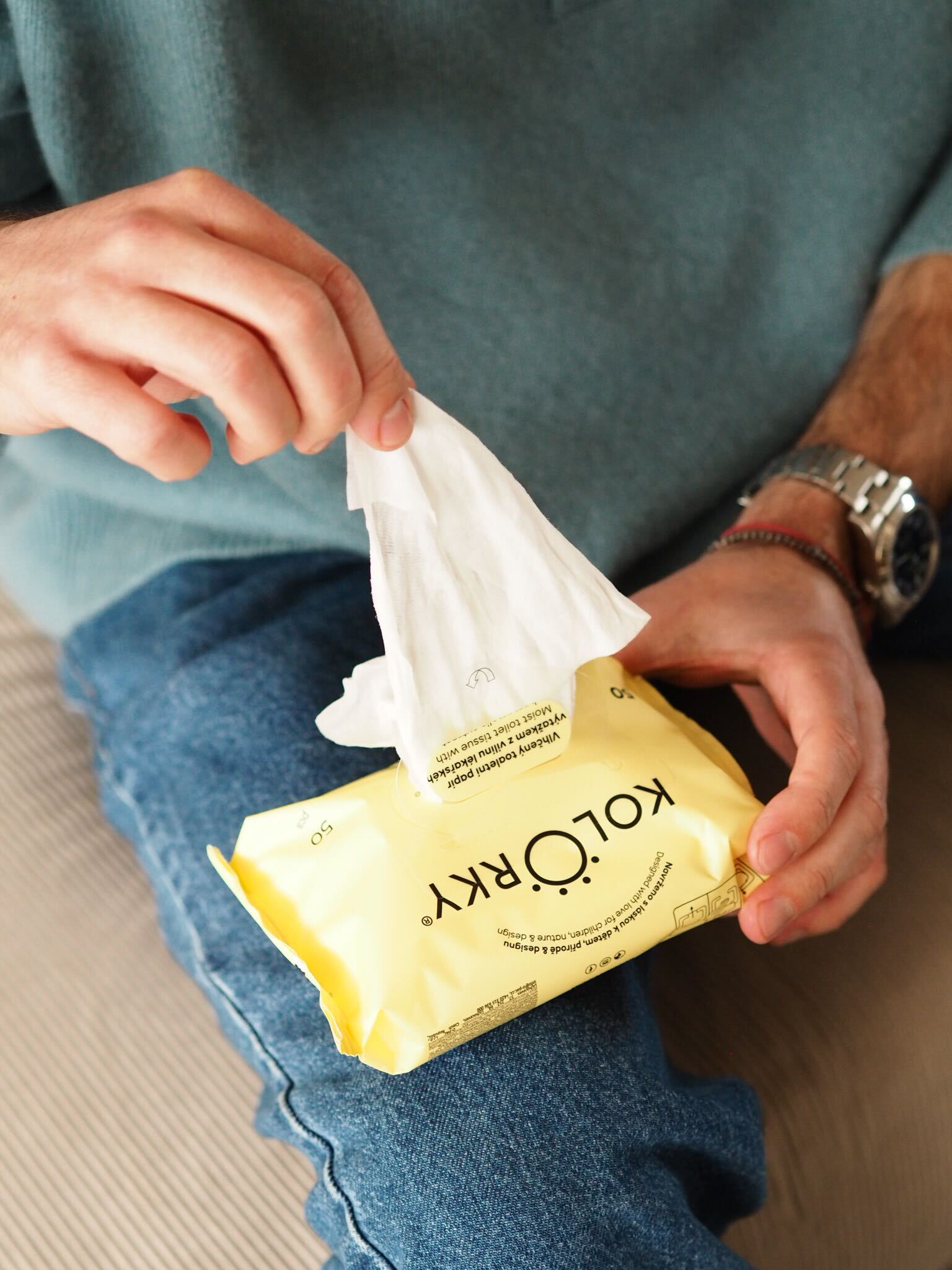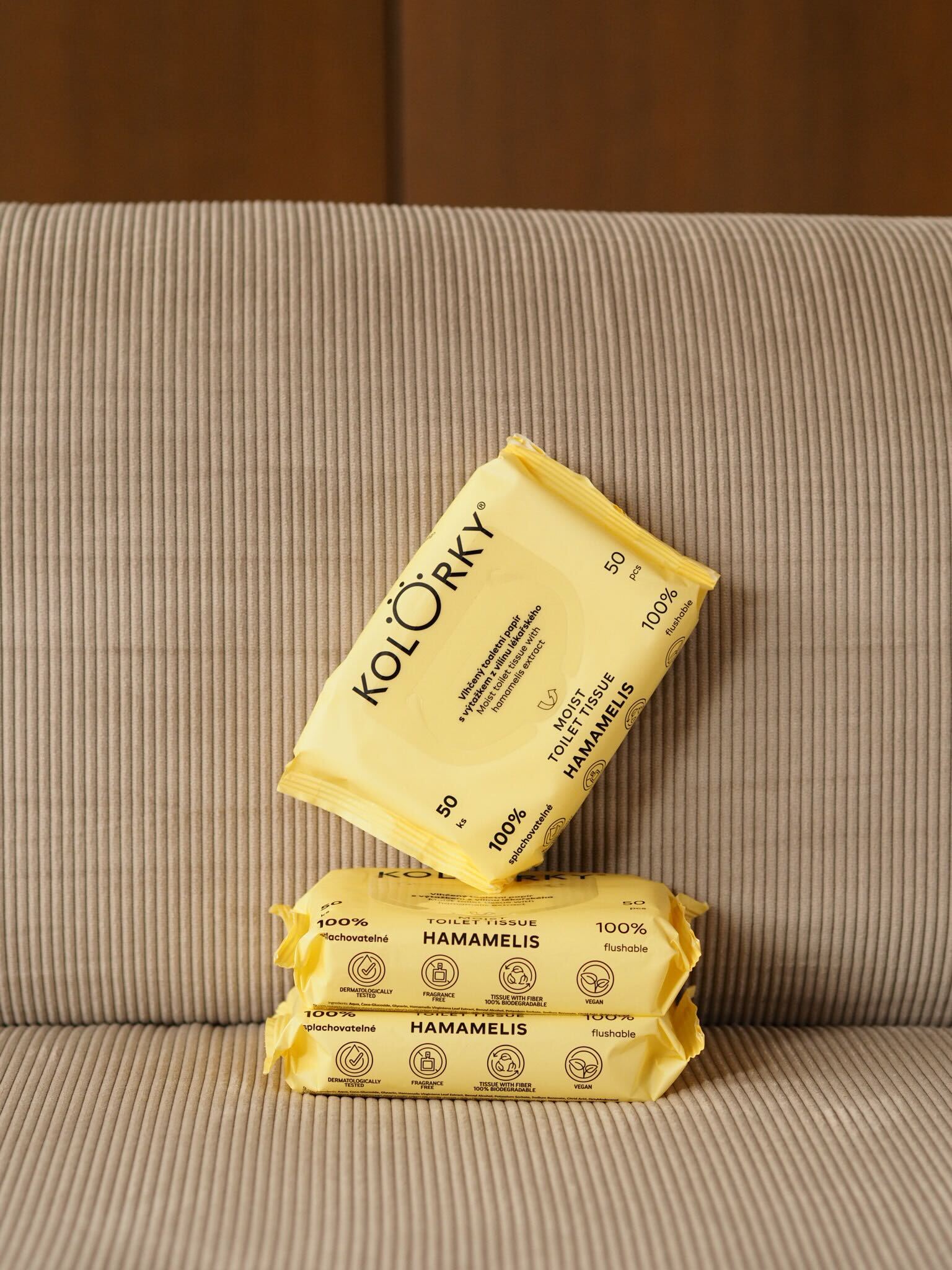 KOLORKY MOIST TOILET TISSUE Hamamelis je izdelan iz naravnih materialov, zato je 100 % biološko razgradljiv. Ta vlažen toaletni papir vsebuje izvleček hamamelisa, ki pomirja občutljivo kožo, pomaga preprečevati draženje in podpira naravno zaščitno pregrado kože. Izdelek je brez dišav. Embalaža toaletnega papirja je 100 % reciklabilna in jo je mogoče odvreči med ločene odpadke. Robčki so dermatološko testirani.